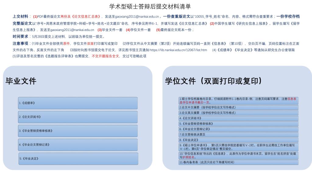 研究生答辩结束后需要及时准备各种毕业及申请学位的材料,学术型硕士生和博士生需要提交的材料清单分别如下: