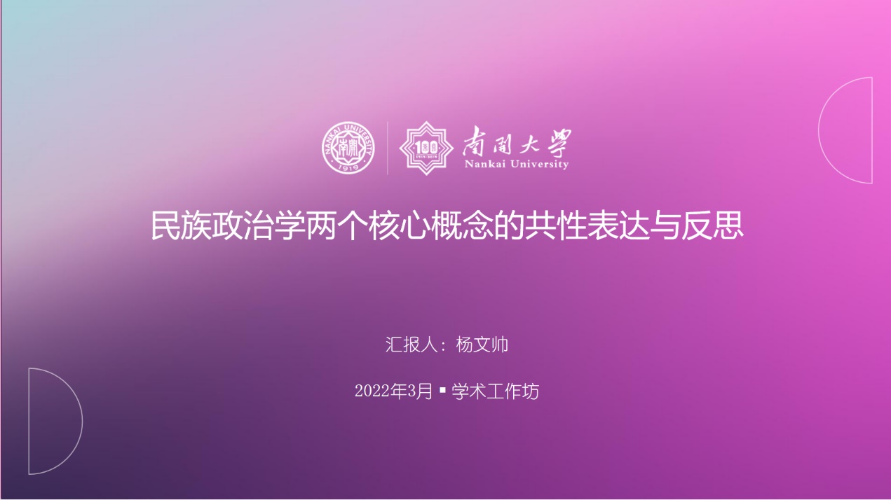 杨文帅同学从“民族”和“民族国家”这两个民族政治学核心概念出发,详细比对了国内外不同学者的研究观点。在分析国内学界基础概念研究方面存在问题的基础上,提出了应当接受概念模糊性、回归社会实践需要的新观点。