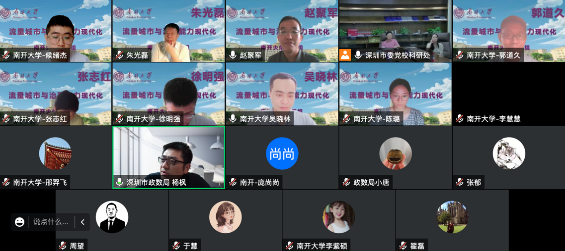 7月14日,朱光磊教授及课题组成员与深圳市政务服务数据管理局相关工作人员进行了座谈。市政数局数据处杨枫处长从深圳市政务服务数据平台架构、大数据资源共享、智慧城市和数字政府建设等几个方面对政数局工作进行了详细介绍。随后,双方就流量城市的政府间协同、大数据赋能机制等问题进行了深入交流。