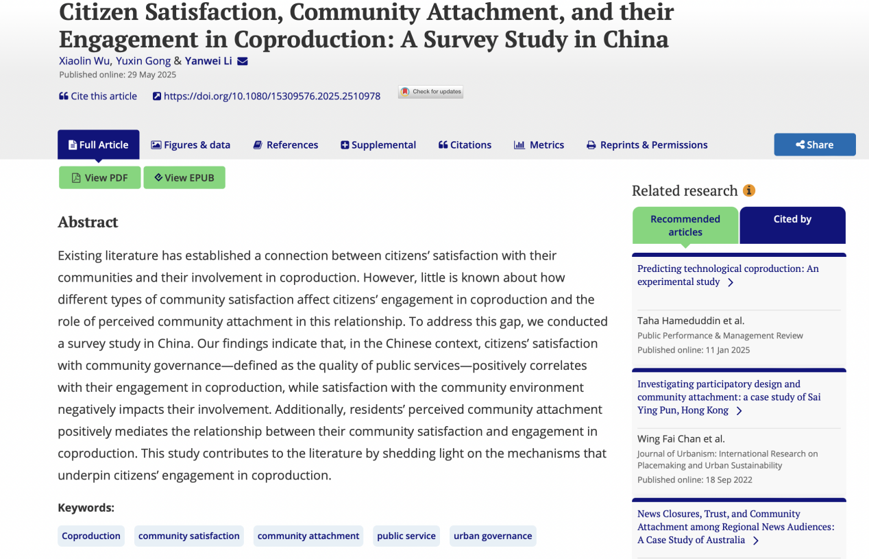 近日,我院吴晓林教授、博士研究生龚宇欣同学与山东大学政治学与公共管理学院李延伟教授合作的学术论文Citizen Satisfaction, Community Attachment, and Citizens’ Engagement in Coproduction: A Survey Study in China被公共管理著名期刊Public Performance & Management Review(PPMR)接受并在线发表。PPMR是美国公共行政学会(ASPA)公共绩效与管理分会(SPPM)的旗舰期刊,也是公共管理学科的标志性期刊之一。