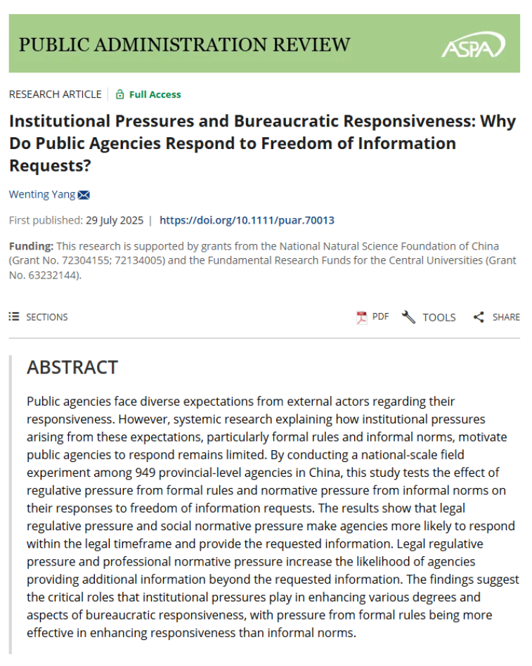 近日,必威betway西汉姆联杨文婷老师的独著论文“Institutional Pressures and Bureaucratic Responsiveness: Why Do Public Agencies Respond to Freedom of Information Requests? ”(《制度压力与官僚回应:公共部门为何回应信息公开申请?》)被公共管理国际顶级期刊Public Administration Review(PAR)录用并在线发表。PAR创刊于1940年,五年平均影响因子为7.3,在90本公共管理国际期刊中排名第一,是公共管理领域最负盛名的学术期刊之一。