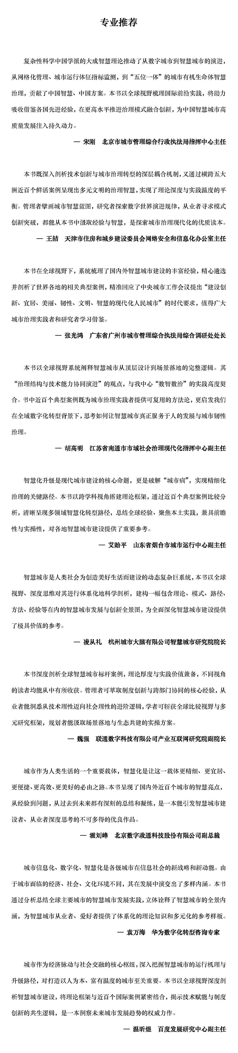 在全球城市化加速与数字化浪潮交织的时代背景下,智慧城市建设已成为各国推动治理现代化、产业升级与公共服务创新的重要路径。然而,迄今为止,尚缺乏一本能够系统梳理全球智慧城市建设经验与典型案例的权威著作。基于此,本书以全球视野为基础,深入探讨了智慧城市建设的背景、现状、实施路径与实践模式,覆盖五大洲主要国家,精选近百个具有代表性的案例,全面呈现全球智慧城市发展的多样图景。书中既总结了北美和欧洲发达国家在智慧交通、绿色能源、数字政务等领域的成熟经验,又展现了亚洲新兴经济体在5G应用、人工智能赋能和城市治理创新方面的快速突破;同时,也囊括了拉美、非洲和中东地区在资源约束条件下探索智慧医疗、公共安全与民生服务的独特实践。全书贯穿“系统性、比较性与实践性”的研究逻辑,不仅关注智慧城市的技术体系,更重视其制度演化与治理创新。纵向上,聚焦单一城市从规划、试点到推广的演进过程,揭示政策连续性与技术迭代特征;横向上,通过跨区域比较,呈现不同国家在数据治理、产业协同、公众参与等方面的差异。本书不仅深度揭示了全球智慧城市建设的普遍规律,也为理解智慧城市发展与国家治理体系、经济结构及社会文化之间的互动关系提供了实证支撑。通过对全球经验的系统梳理与典型案例的深入分析,书中揭示了智慧城市建设由“工具理性”向“制度理性”转变的趋势,提出了构建开放共建、数据共享、智能治理的新型城市发展范式。本书适用于政府决策部门、城市规划机构、研究院所、企业管理者及高校相关专业师生参考,可为理解与推进智慧城市建设提供系统的理论依据与实践指南。