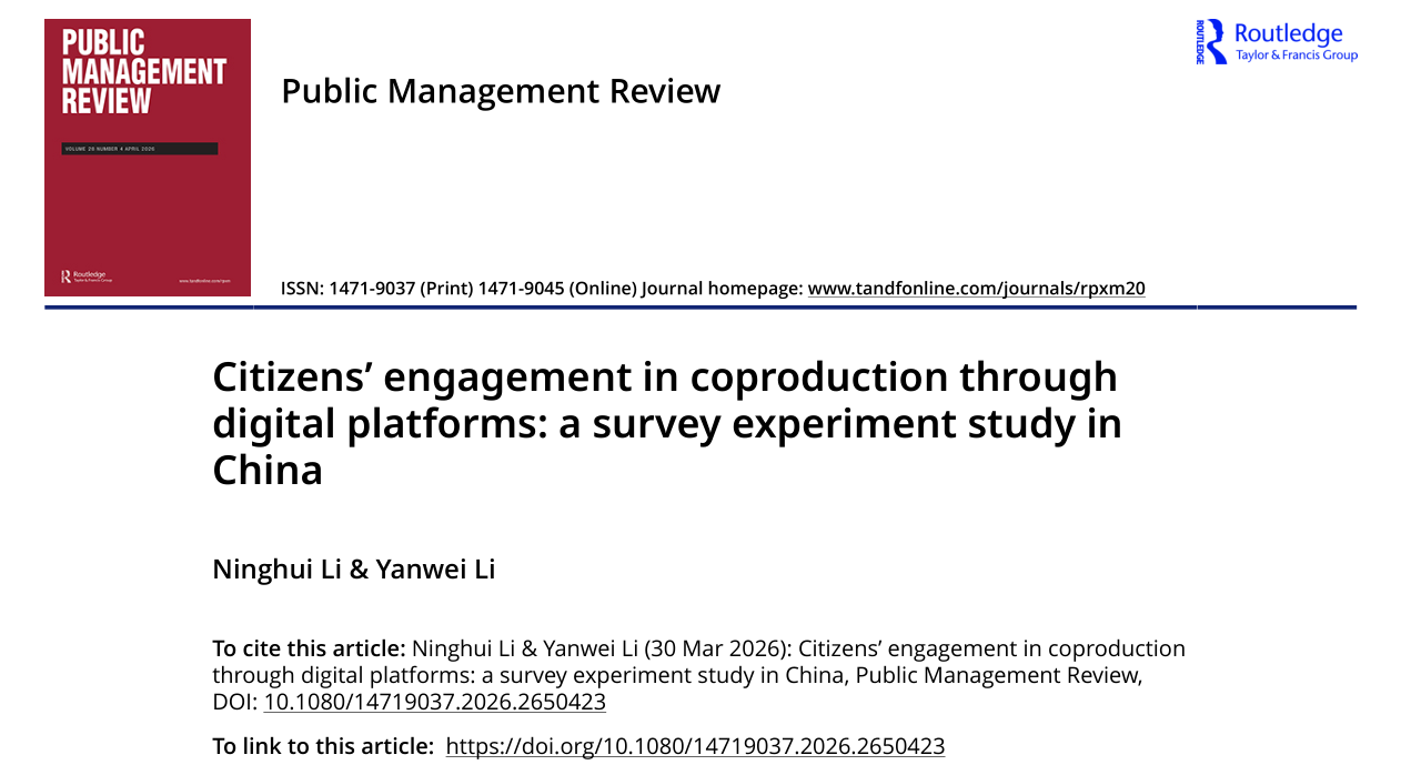 近日,必威betway西汉姆联博士研究生李宁卉(第一作者)和山东大学政治学与公共管理学院李延伟教授(通讯作者)合作的学术论文“Citizens’engagement in coproduction through digital platforms: A Survey Experiment Study in China”,被公共管理领域国际顶级期刊Public Management Review(PMR)接收并在线发表。PMR由 Taylor & Francis出版,是国际公共管理研究学会旗舰刊物,办刊宗旨是推进公共管理领域的理论和经验研究。PMR期刊在公共管理类别中位于Q1区,为公共管理领域影响力最高的期刊之一。