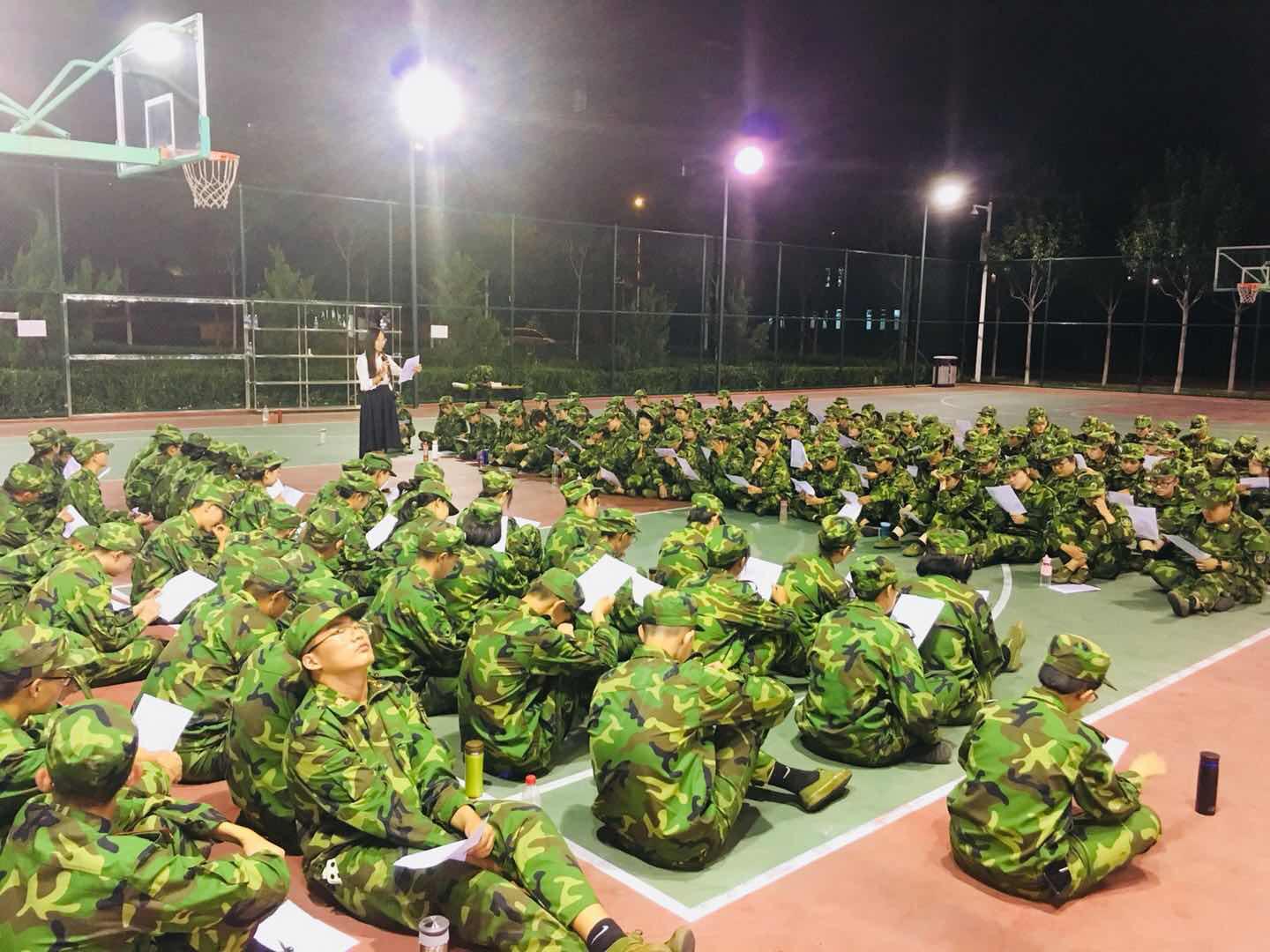 在此之前,政府学院的同学们在学长们的组织下,利用晚训空余时间学习了连歌《当那一天来临》,并在分声部站好队后反复练习。记得大家席地而坐纷纷学唱的欢快神情,毫不在乎到处的蚊蝇,排练活动整体氛围轻松、井然有序,大家都热情高涨、进步显著。