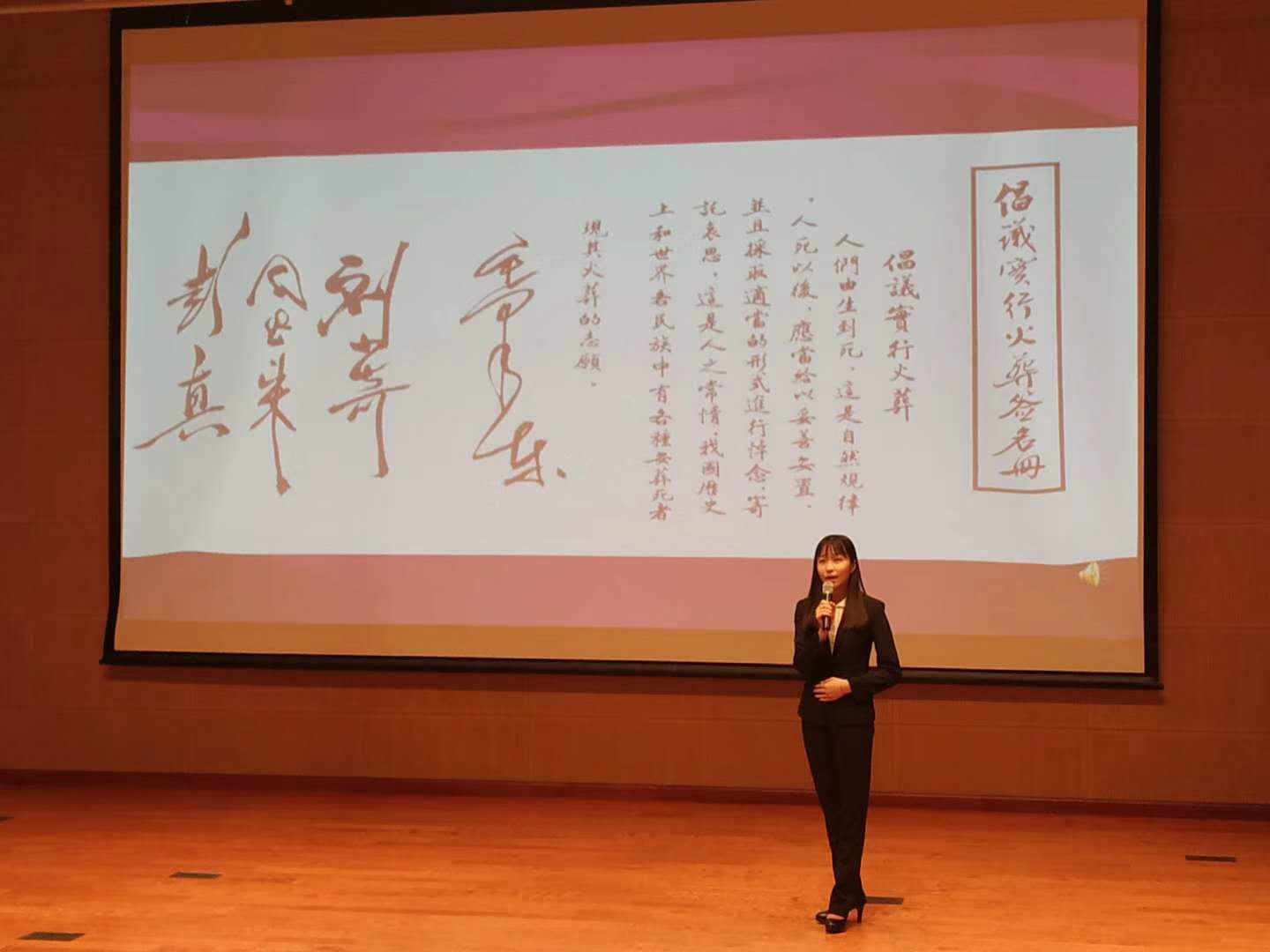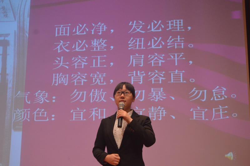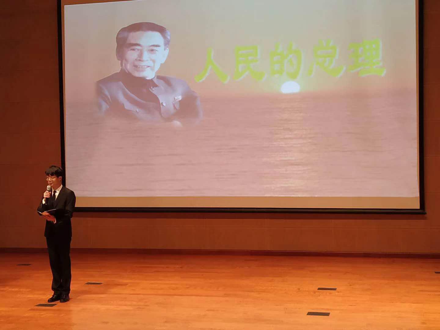 在恩来精神展演团演说环节,成员首先向学生们讲述了“周恩来与容止格言”,通过介绍周总理大方得体的仪容仪态,强调了注重仪容举止的重要性。随后,成员们相继讲述了与周总理有关的一系列故事:“西花厅的“风波””里,周总理坚决反对重修自己的房屋,展现了总理“安得广厦千万间,大庇天下寒士俱欢颜”的伟大情怀;“总理的家风”里,周总理以身作则,体现周总理严格要求家属,恪守孝道的行为准则;“最后的日子”里,周总理在生命最后的587天拖着病体坚持工作,体现了一位身患绝症的老人为国为民,顾全大局的崇高精神;“一个骨灰盒”的故事里,周总理的骨灰撒向祖国大地,体现了总理对祖国河山的深沉热爱;一首“海棠花祭”的朗诵,表达了同学们对总理深深的怀念……展演团充满激情的演讲,使同学们深受感动,热泪盈眶。