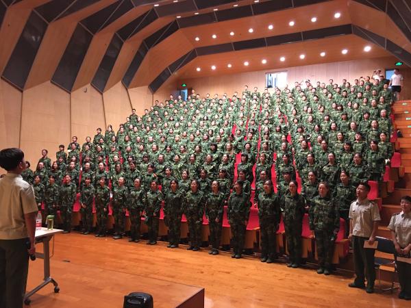 随后,指导员耿欣伟向参训学生公布了各个班排的分配结果以及八连的口号——“军纪如铁,意志如钢,钢铁八连,斗志昂扬”。全体参训学生起立,一起喊出这振奋人心的口号,声音响彻整个会场。
