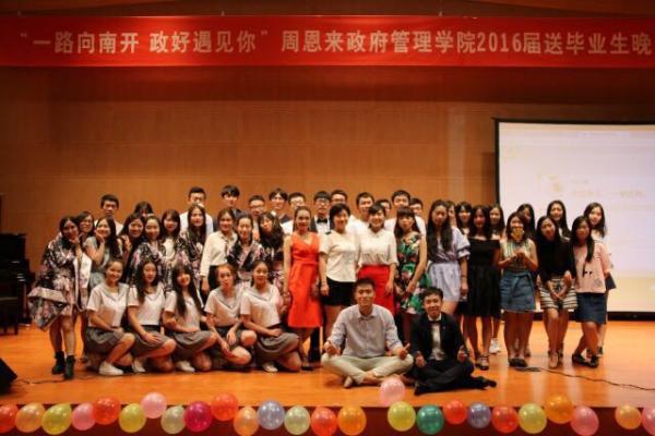 第二个节目来自12级行政管理的同学。一首一生有你,婉转悠扬,道出了青春的迷惘与执著,青春的感动留在大家心中。第三出场的是刘书冰同学,她带来傣族舞蹈彩云之南,傣家姑娘的曼妙身姿仿佛把我们带到了湿热的云南。接下来是冯晓璇,丁盛楠,陈晨,房懿同学合唱的小幸运,默契的眼神与有魅力的和音让观众席气氛十分热烈。紧接着鸿迪孜同学身着白色民族裙装带来的民族舞蹈天鹅,利落的动作让我们看到了哈萨克族别样的民族风情。12级社会的同学们给我们带来南开学子原创歌曲,南开 秋天,歌声仿佛把南开秋天金黄的落叶和当初入学的悸动都带到了现场。下一个节目是12级国际政治班的靓丽女生的韩舞串烧,热辣的舞姿把现场气氛火速提升。12级应用心理的女生带来舞蹈怦然心动,独特的清纯魅力和有力的动作形成反差,给大家带来极佳视听享受。12级行政管理男生们带来不可描述的舞蹈。揉合了千手观音,四小天鹅,小鸡小鸡等耳熟能详的舞蹈,活泼的动作将现场气氛推入高潮。中场互动环节,国际关系系主任韩召颖与毕业生们一起进行接力式你划我猜游戏,生动有趣。田拓与朱功伟带来的相声《我要毕业》细数四年大学生活,以幽默风趣的方式给毕业画下一个完美的句号。12级社会工作专业毕业生带来的《辉夜城之舞》将晚会推向高潮,欢呼声不断。12级国际政治的一曲《尚好的青春》唱出了多少毕业不舍,但无论怎样,还是要笑着说一句,毕业快乐!