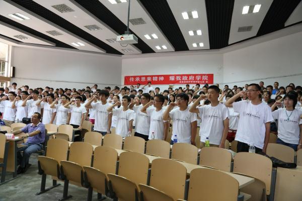 在历年军训精彩照片的回顾中,会议拉开序幕。首先,奚先来老师进行了发言,他在思想上和行动上对同学们提出了要求,希望大家能以军人的身份要求自己。之后,来自12级的三位同学与新生分享交流了自己对军训的感悟和一些经验。关于军训期间的具体要求,辅导员杨晓颖为同学们做了仔细的介绍与说明,她也希望同学们能发扬钢七连的优秀传统,再创佳绩。最后,在军旗前同学们在七连副指导员殴喜乐的领誓下,庄严宣誓。他们的铮铮誓言在三阶中久久回荡,那声音里饱含了他们吃苦的决心和必胜的信念。