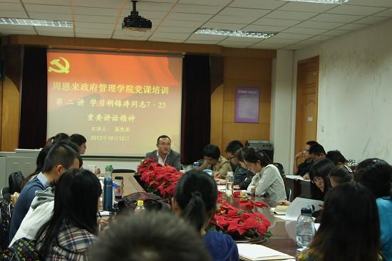 为迎接十八大,统一思想,提高认识,政府学院党委于10月12日下午举办了新学期第二场党课培训,学习胡锦涛总书记“7•23”重要讲话精神。学院党委副书记兼副院长奚先来主讲,学院学生党员骨干和本科新生党员参加此次培训。
