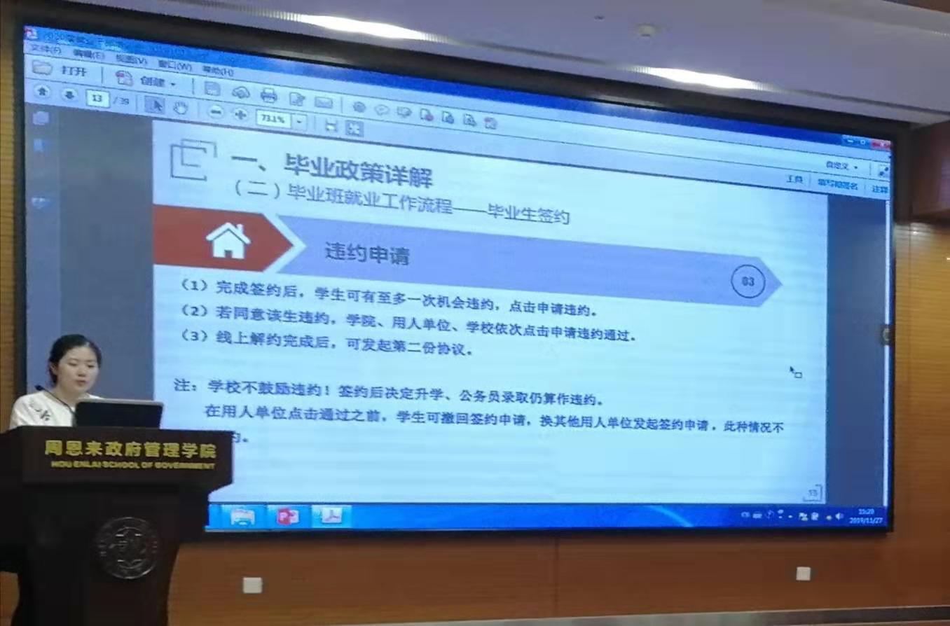 2016、2017级辅导员王燕就就业政策、签约流程、Betway·必威(西汉姆联)就业管理系统使用等方面进行了讲解。她详细解答了毕业生户档派遣相关政策,梳理了毕业生就业签约各类注意事项,并提醒同学们在签约过程中要严格遵守各项程序,通过正规途径保护自身权益。同时,王燕结合近期选调生材料填写情况,提醒同学们提高诚信意识,实事求是。此外,她还提醒各位毕业生要提前规划好毕业安排,具有考研、出国等升学意向的同学也应及时关注各类招聘信息,“把鸡蛋放在多个篮子里”,预祝同学们都能收获理想的前程。