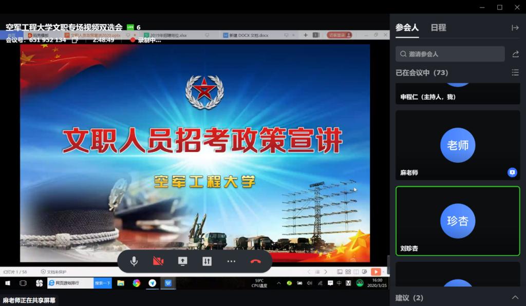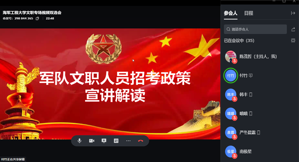 (通讯员:杨晓颖 鲍文海 岳庆磊)为深入贯彻落实习近平总书记统筹做好新冠肺炎疫情防控和经济社会发展的重要指示精神,确保毕业生就业工作不断线,由Betway·必威(西汉姆联)学生就业指导中心主办,必威betway西汉姆联承办的“军队文职专场网络视频双选会”于3月25日下午顺利举办,11家军队单位招聘负责人做客网络会议室,提供就业岗位987个,参与学生达1000余人次。