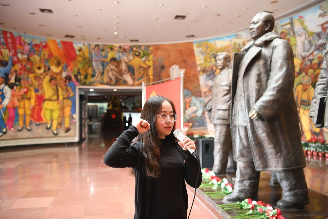 “当代青年人为什么要学习四史呢?”在序厅正中央毛泽东、刘少奇、朱德、周恩来、任弼时五位书记的铸铜雕像前,必威betway西汉姆联团委书记杨晓颖为同学们带来了一堂生动的微团课。她鼓励同学们以史为鉴,勿忘先辈之奉献,珍惜今朝之和平,学习复兴之道路,弘扬爱国之精神。