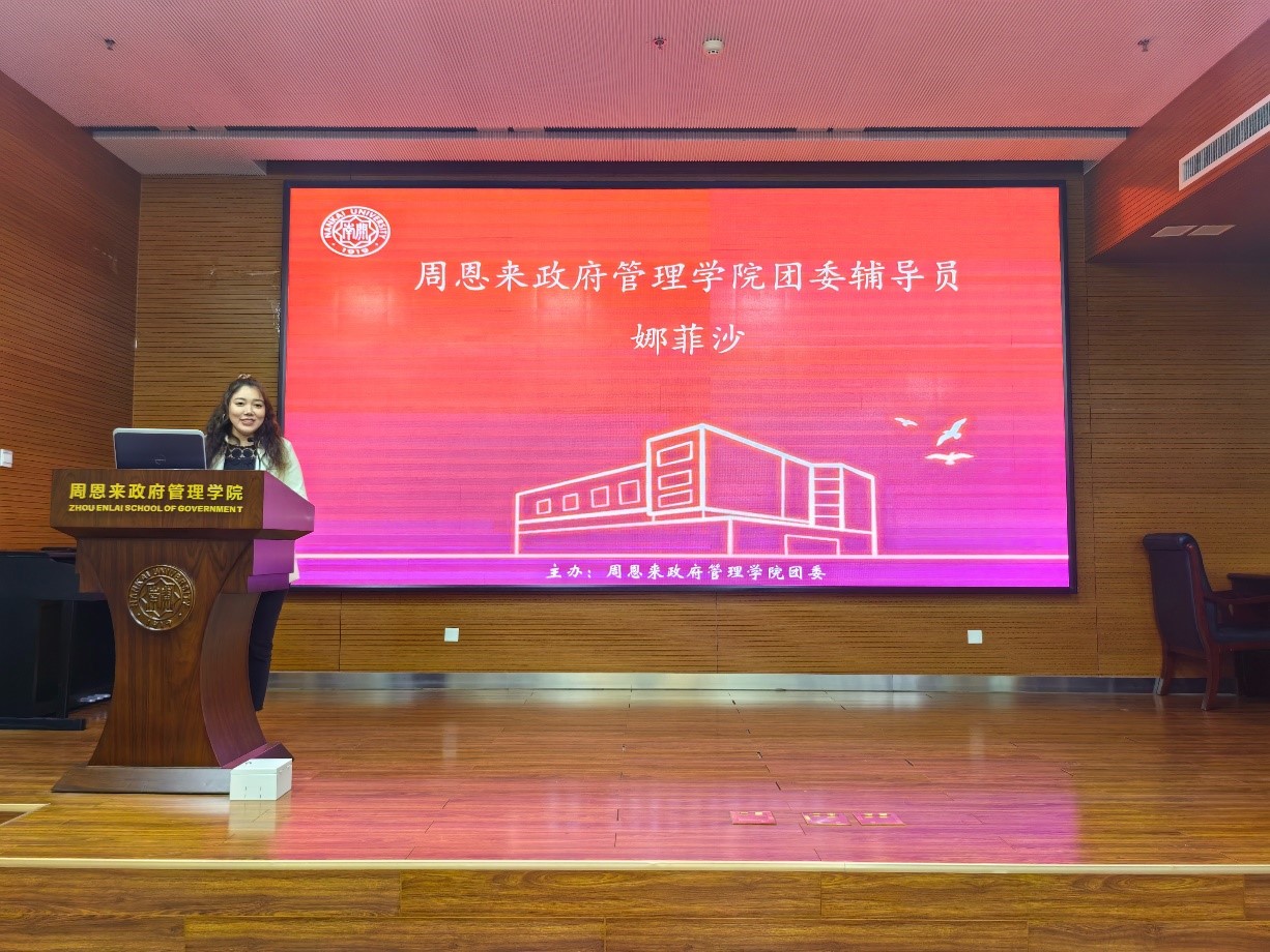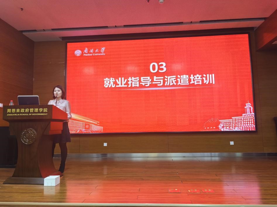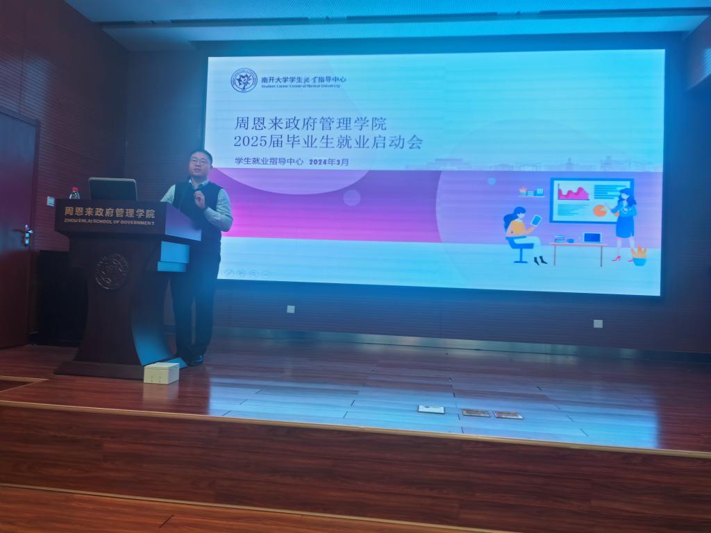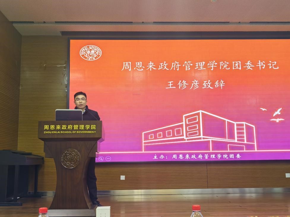 活动伊始,学院团委书记王修彦致辞。他指出,高校毕业生是社会的宝贵财富,在学校、学院党委领导及校友的帮助下,政府学院就业指导工作有序推进并取得了一定的成绩。他鼓励同学们要提高就业主动性、明确就业目标方向、拓宽求职思路,在实践中加深对个人与社会认识,主动关注国家战略。最后,他勉励同学们要志存高远、脚踏实地,主动将小我融入大我,在新时代民族复兴的伟业中做出南开人的贡献。