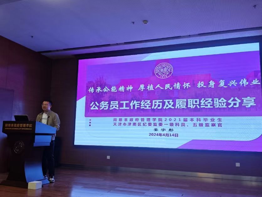 我院院友姜宇彤和杨笑颜分别进行了经验分享,结合自身经历从选岗备考建议、工作经历介绍、履职经验分享、心理状态调适等多方面开展公考方向的全方位就业辅导,帮助同学们牢记初心使命、合理规划就业、脚踏实地发展。本次活动还邀请了3位2023届来自党政机关的毕业生寄回了经验分享与祝福视频,3位毕业生结合自身经历提出了宝贵的经验建议。