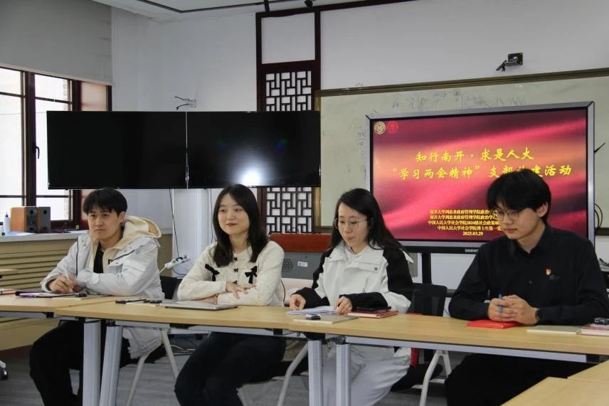 在活动讨论环节,两校党员组建了六个跨校研究小组,围绕“南开政学启新思,人大社研悟两会”主题,在政治学、社会学、公共政策等学科视角下探索两会精神的内涵,分别就“实施就业优先战略”“深化教育‘双减’改革”“完善分级诊疗与医保支付体系”“加速普惠型养老服务体系建设”“优化保障性住房供给与长租房市场”“推进乡村振兴与城乡融合发展”等问题进行深入研究,并分别完成五分钟主题宣讲。在成果汇报环节,各位党员积极踊跃发言,分享对以上领域的真知灼见,展开了激烈的讨论。