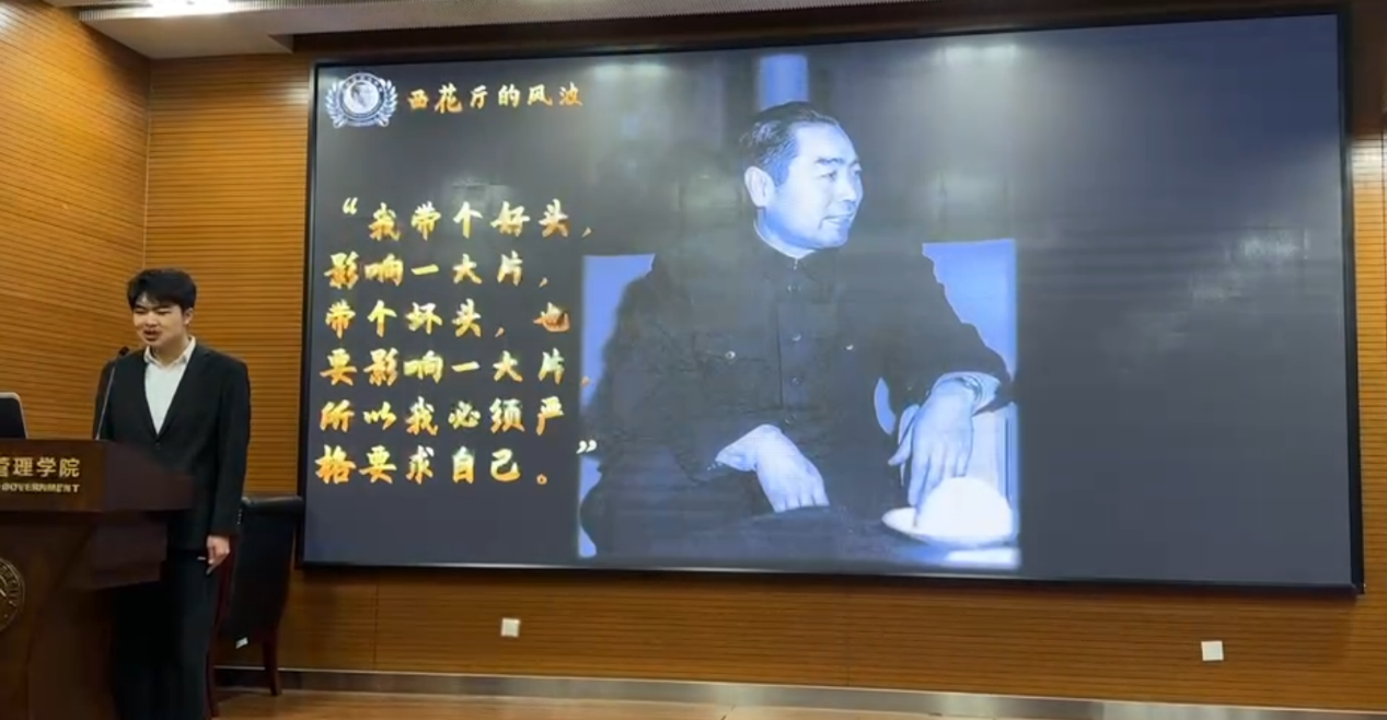 周恩来总理的卓著功勋、崇高品德、光辉人格,早已深深镌刻在全国人民心中。1959年,关于西花厅一场小风波的故事,让同学们领略到周总理与人民同甘苦、共命运的信念和准则,展现了周总理廉洁奉公、艰苦朴素的高尚品格。