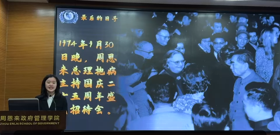 接下来,恩来精神展演团在线上为职校同学们带来了恩来故事展演。展演团成员——2023级国际政治专业胡傲、2023级社会学专业熊昱昕、2024级公共管理专业岳川程为大家带来了展演《西花厅的风波》、《最后的日子》,将周总理为国家、为人民无私奉献的形象鲜活地呈现在同学们面前。