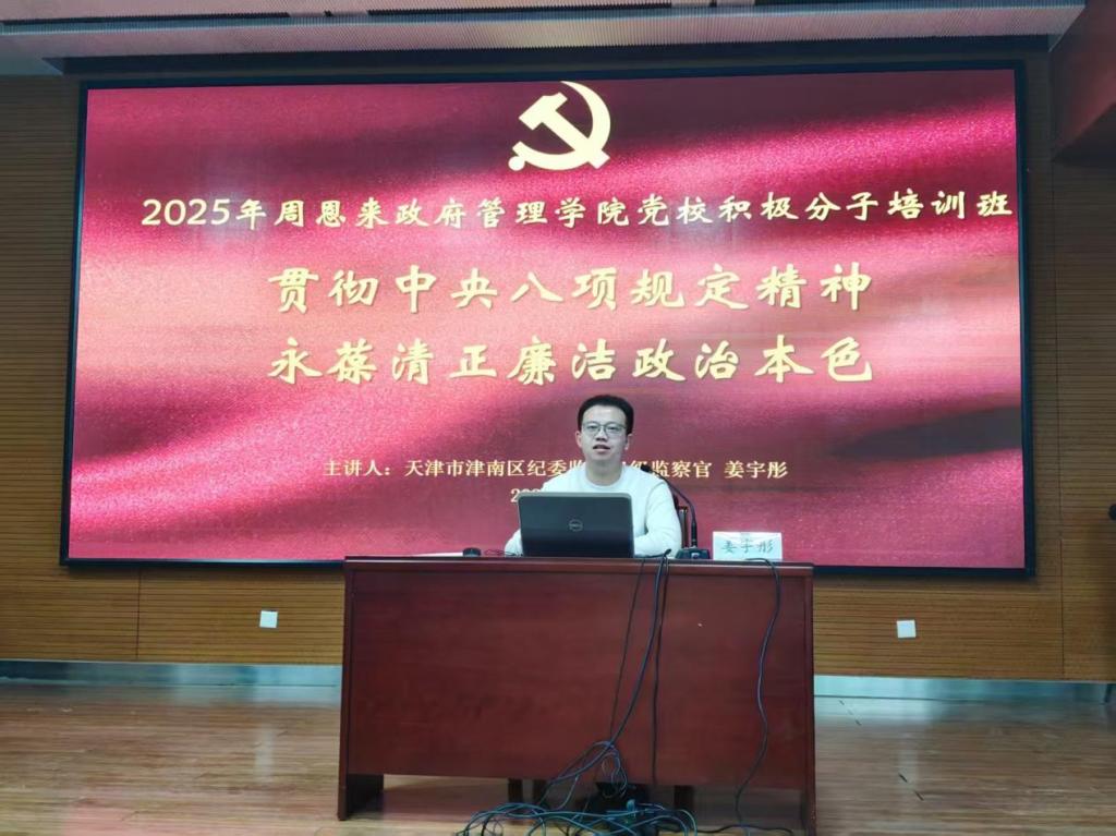 为深入贯彻党的二十大精神,切实加强入党积极分子思想教育,着力提升其思想政治素养,必威betway西汉姆联于4月20日举办了入党积极分子培训班开班仪式。培训班第一讲以“贯彻中央八项规定精神,永葆清正廉洁政治本色”为主题,特别邀请学院2021届本科毕业生、天津市津南区纪委监委干部姜宇彤以及恩来精神展演团进行展演,学院70余名入党积极分子参加学习。