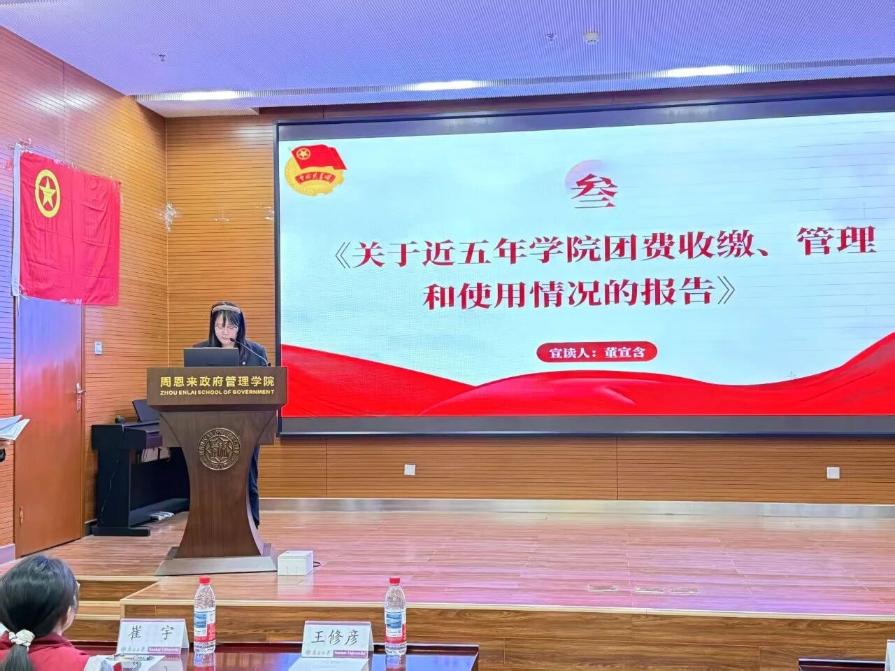 学院团委组织部负责人董宣含宣读《关于近五年学院团费收缴、管理和使用情况的报告》。在收缴情况方面,各年度收缴情况基本稳定,所缴团费全数上缴校团委;在管理情况方面,学院团费实行账户专管专用,确保账目明晰,严格规范团费收支流程,团费收集汇总后统一提交至校团委指定账号;在未来工作方面,组织部负责人表示将继续恪尽职守、勇于创新,把团费收缴、管理和使用工作抓得更实、更细、更规范。