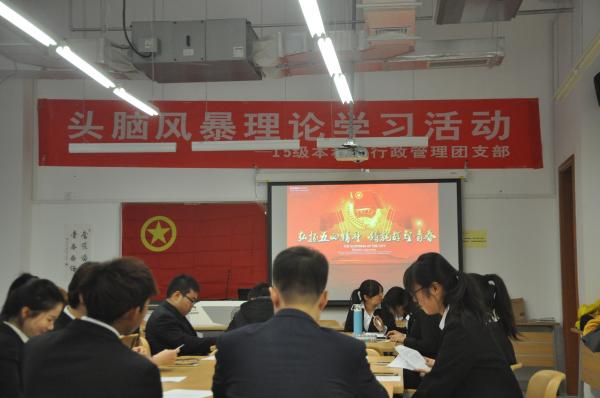 (通讯员:范钰宁、耿欣伟、陈佩其)11月24日下午,我院2015级行政管理团支部成功举办理论学习活动。院党委副书记、副院长奚先来老师,班导师李晨光老师,辅导员陈佩其老师出席了活动。本次活动采取了头脑风暴竞赛的形式,旨在全面深入学习十八届五中全会及习近平系列讲话精神。全班同学积极参与,热情高涨,活动反响热烈。