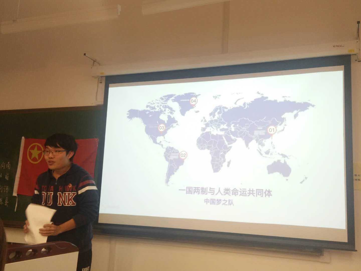 本次理论学习活动以 "' 史' 志不渝,' 政' 看今朝"为主题,结合"砥砺奋进的五年"大型展览、"十九大"的胜利召开、新一届中央政治局常委参观中共"一大"会址等时事热点,进行学习、交流。活动由团支书冯辉主持,在全体团员激昂的团歌声中开始。"史"志不渝部分,大家在"新闻联播"板块中认真观看了《我们的自信- 道路篇》和《新闻联播》中"中央政治局常委参观中共' 一大' 会址"的视频,对总书记"不要忘了走过的过去,不要忘了当初为什么出发"的教诲有了更深刻的了解,随后 全体团员在团支书的领誓下,面对团旗重温"入团誓词",回顾自己入团初心。第二模块"时空穿梭,初心再现"部分,二十余名团员表演了话剧《开天辟地》,重现中共"一大"的光辉场景,赢得同学们的赞赏与掌声,并且选出了"最佳戏骨"。