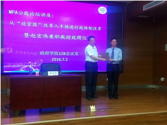 朱光磊副校长在致辞中指出,赵宏伟主任是思考型官员,具备丰富的管理经验和广泛的社会联系,这对于政府学院而言是非常重要的。感谢赵主任接受兼职教授的邀请,代表学校和学员学术委员会接受兼职教授的邀请表示热烈祝贺和衷心感谢。希望赵主任对相关专业的相关教育给予大量的支持和帮助,对研究生进行指导。
