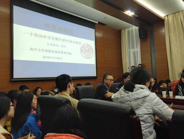 在提问交流环节,徐步根据同学们的疑问,就国际关系理论、朝核问题、南海问题以及外交战略等方面进行了探讨解答。徐步高度评价了南开学生的知识素养和提问水平,并希望青年学生能够传承中国的历史文化,敬畏文化,热爱祖国,不断学习。