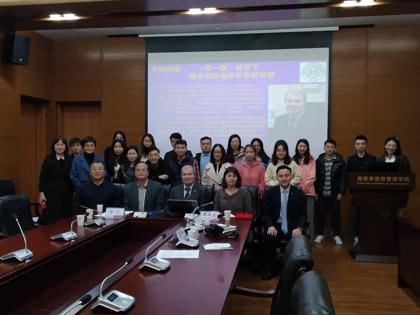 合谈后,在我院144会议室举行了博格金教授致聘仪式和学术报告。致聘仪式由刘丰副院长主持。徐行教授介绍了博格金教授杰出的学术成就,并宣布聘请其为我校周恩来研究中心特邀研究员。学院党委书记王慧为博格金教授颁发了聘书并发表了讲话,博格金教授发表了受聘致辞。