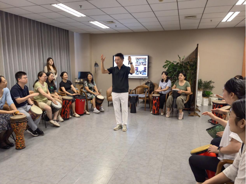 田野老师还带领大家完成了丰富多彩的体验活动。在鼓圈活动中,随着田野老师的手势和动作,参与者敲击着鼓面,产生不同节奏的鼓声,鼓声不断,高潮迭起;随后,参与者分别使用鼓、甩琴、三角铁等乐器即兴伴奏并合唱了两首歌曲,共同创造了美妙的和弦;最后进行了音乐冥想放松训练,聆听着海洋的声音,参与者在田老师指导下进行有规律的呼吸放松和肌肉放松,让放松的感觉在身体内流动,产生了缓解心理压力的良好作用。
