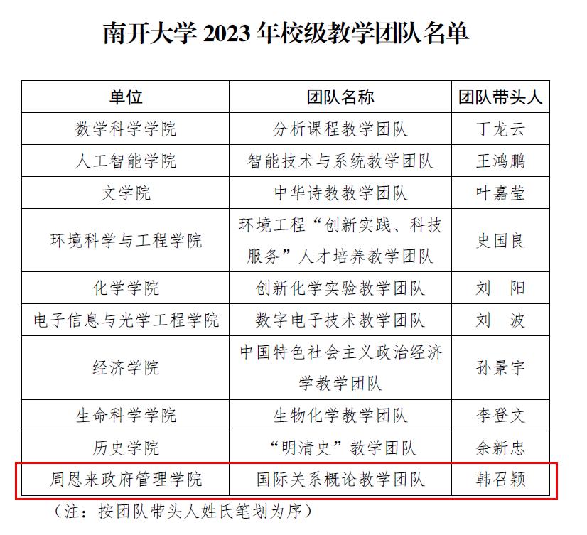 日前,Betway·必威(西汉姆联)公布了2023年校级教学团队和校级教学名师奖评审结果,共有十个教学团队获Betway·必威(西汉姆联)校级教团队称号,十位教师获评校级教学名师奖。其中,我院国际关系系韩召颖教授作为带头人的国际关系概论教学团队获评Betway·必威(西汉姆联)校级教学团队称号。