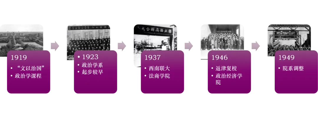 1919年,南开学校大学部成立之初,秉持“文以治国”的理念便开设了政治学课程;1923年设立政治学系,成为国内较早发展政治学的高校之一;期间经历了西南联大三校合并的政治学系、1946年复校后的政治学系和院系调整后政治学在相关专业的分散延续等阶段。