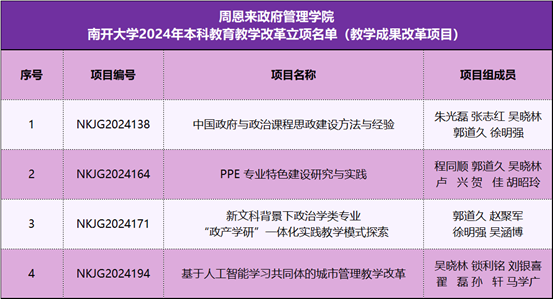 我院获得四项教学成果改革项目立项。其中,由朱光磊教授担任首席专家的《中国政府与政治课程思政建设方法与经验》,由程同顺教授担任首席专家的《PPE 专业特色建设研究与实践》,由郭道久教授担任首席专家的《新文科背景下政治学类专业“政产学研”一体化实践教学模式探索》,由吴晓林教授担任首席专家的《基于人工智能学习共同体的城市管理教学改革》均获得立项。