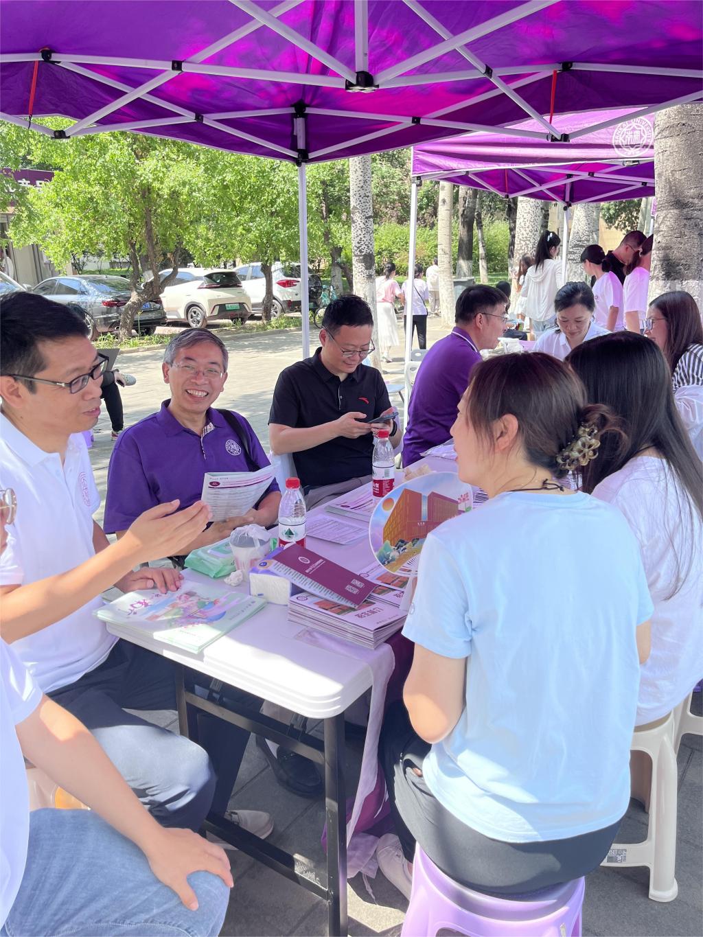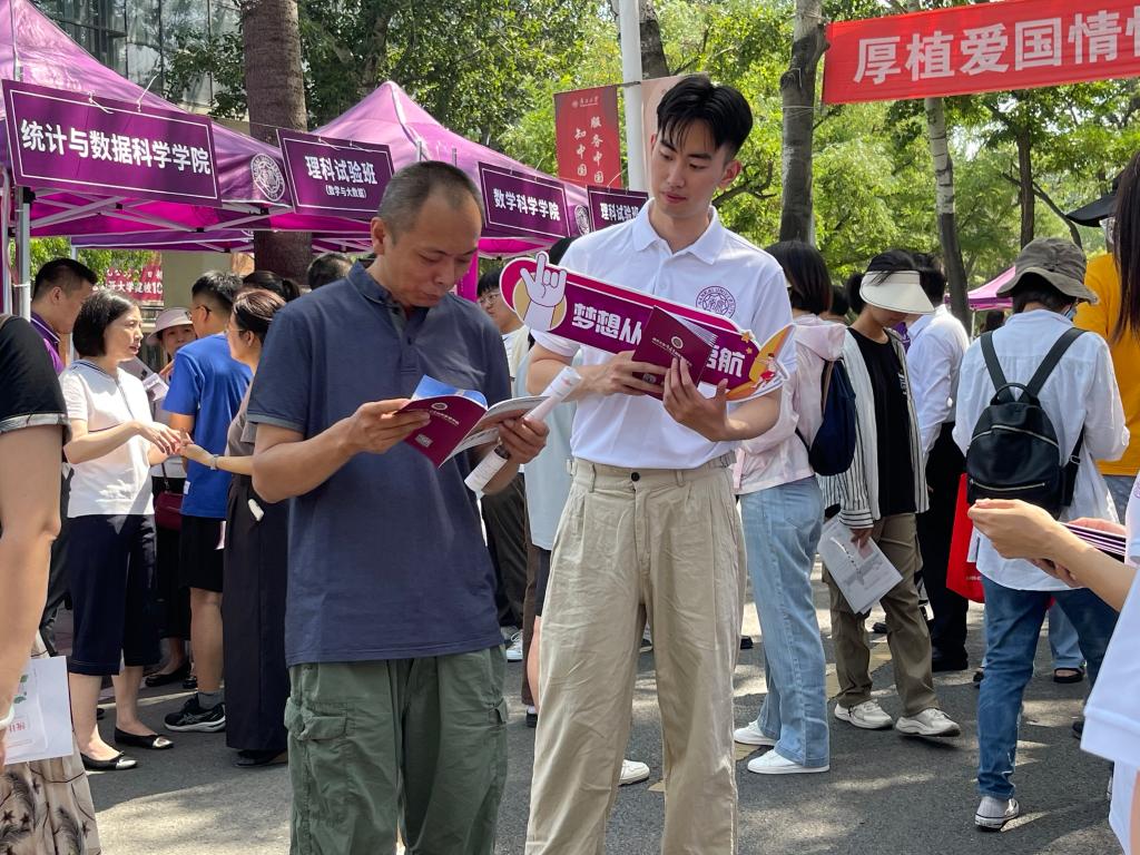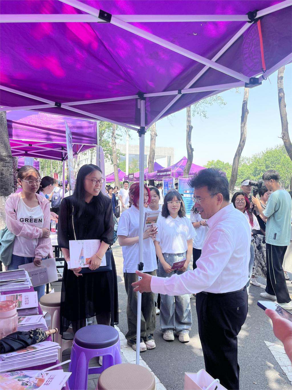 我院师生志愿者耐心地为考生和家长答疑解惑,宣介我校、我院学科特色与独特优势。专业特点、课程安排、大类分流与转专业政策、特色班培养、升学去向、就业前景等都是学生和家长较为关心的问题。期间,陈军副校长及学校招办主任金柏江来到我院展位,与师生志愿者及前来咨询的考生、家长亲切交谈。