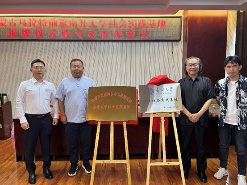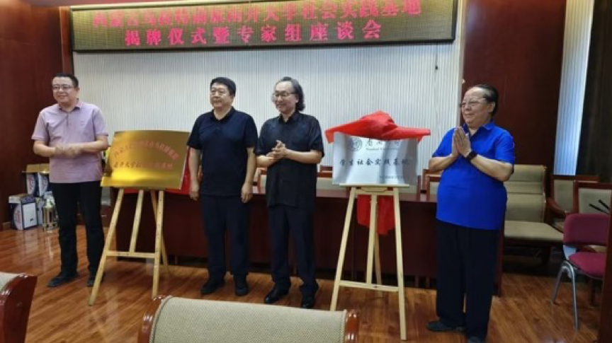 接着,我院研究生代表王特日格乐和学校本科生代表郭禹含分别致辞发言。之后,乌拉特前旗党委宣传部长郝民、乌拉特前旗政协主席金山、我院陈巴特尔教授、内蒙古师范大学巴▪孟和教授一起为基地揭牌。