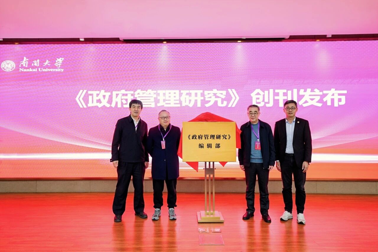 在热烈的掌声中,天津师范大学佟德志教授、《新华文摘》高级编辑胡元梓、南京大学政府管理学院张凤阳教授、清华大学公共管理学院梅赐琪教授(图片从左到右的顺序)共同为《政府管理研究》期刊揭幕,并合影留念。