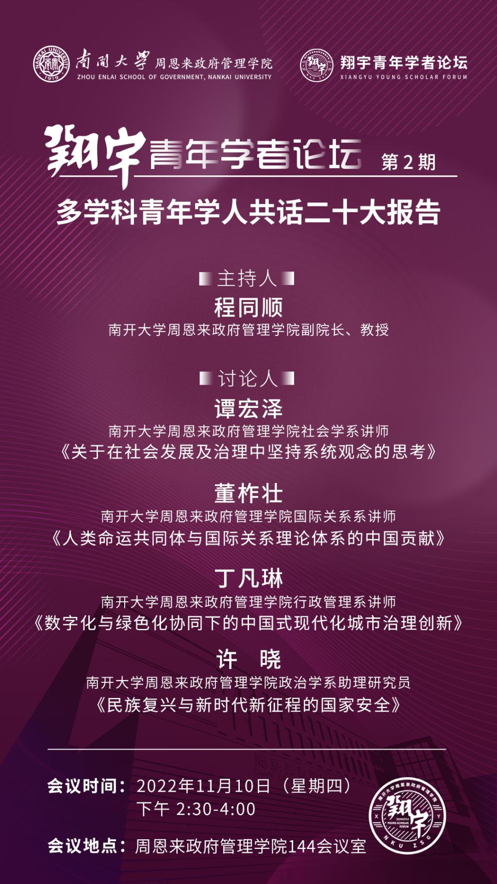 “翔宇青年学者论坛”(简称“翔宇”论坛),开启于党的二十大胜利召开之际,是必威betway西汉姆联为青年学者搭建的学术交流平台。“翔宇”论坛以南开最杰出校友周恩来的字号“翔宇”为名,力图以恩来师长为榜样,以允公允能为宗旨,以经世致用做原则,鼓励青年学者将学问作在祖国大地上。论坛采用讲座报告、学术对话、经验分享、专家讲授等多种形式,鼓励具有不同学科背景的青年学者交流切磋、倡导学科交叉互动、致力于打破学科间藩篱、追踪学术发展最新前沿,以为探寻中国自主知识体系构建和国家民族发展,做出力所能及之贡献。