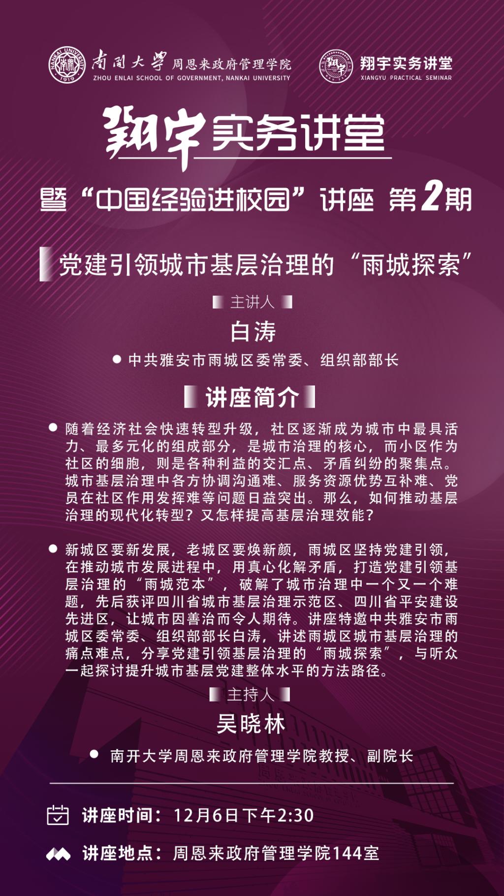 “翔宇”实务讲堂采用讲座报告、经验分享、对话对谈等多种形式,欢迎躬身一线的实务工作者报名参加,将凝聚中国智慧、彰显中国特色的经验带进校园,同青年学生与专家学者互动交流,共同提炼中国式现代化的“治理密码”,促进理论与实务的互动,助力国家治理体系和治理能力现代化。