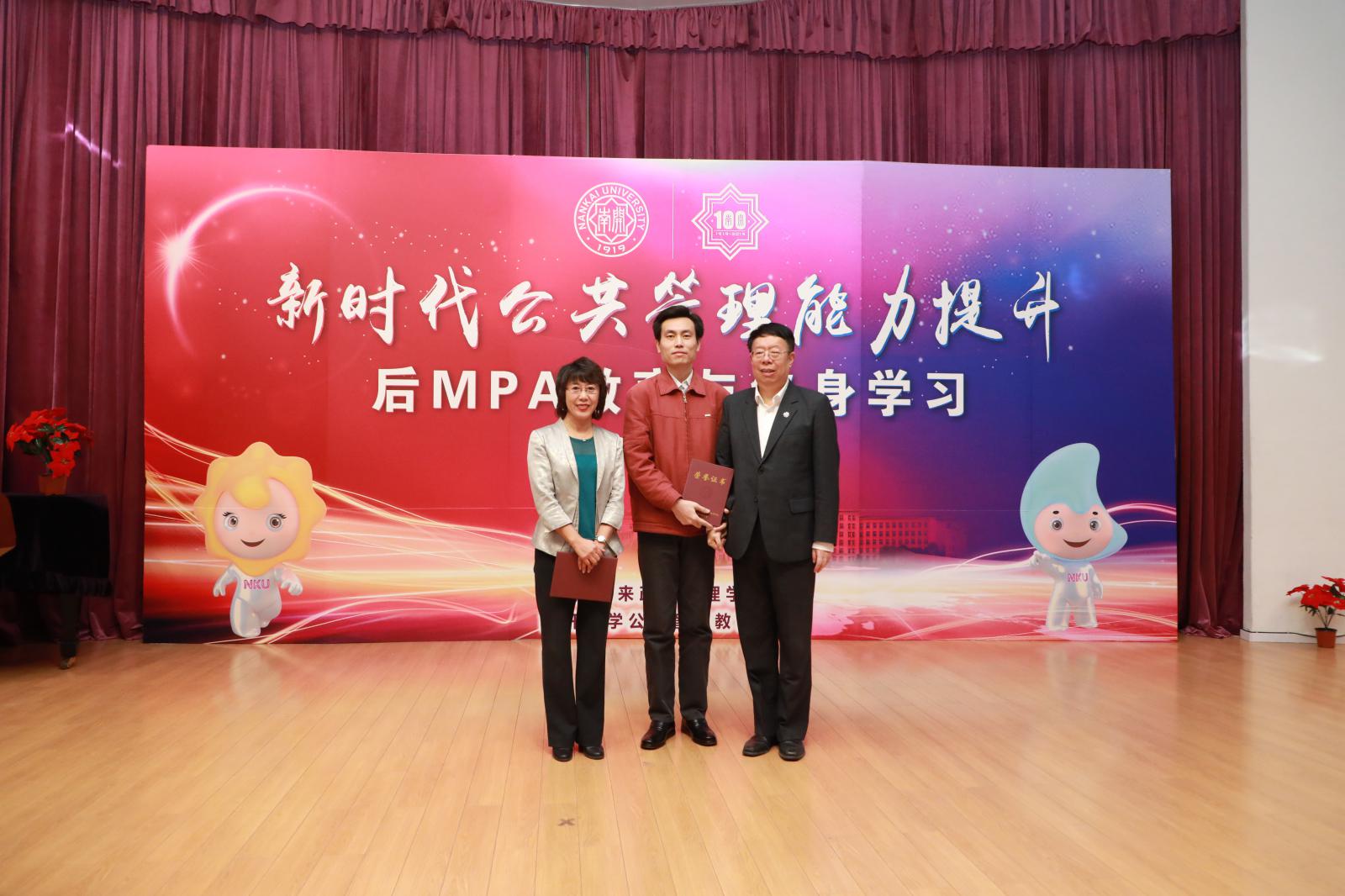 王慧为获得全国公共管理(MPA)优秀学位论文的作者及导师颁发证书。