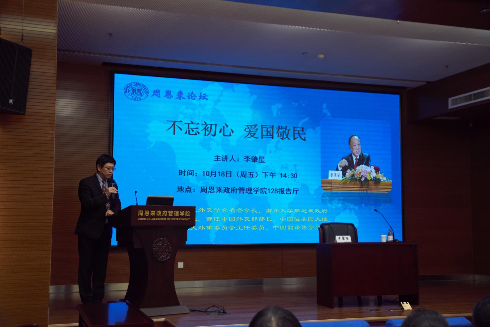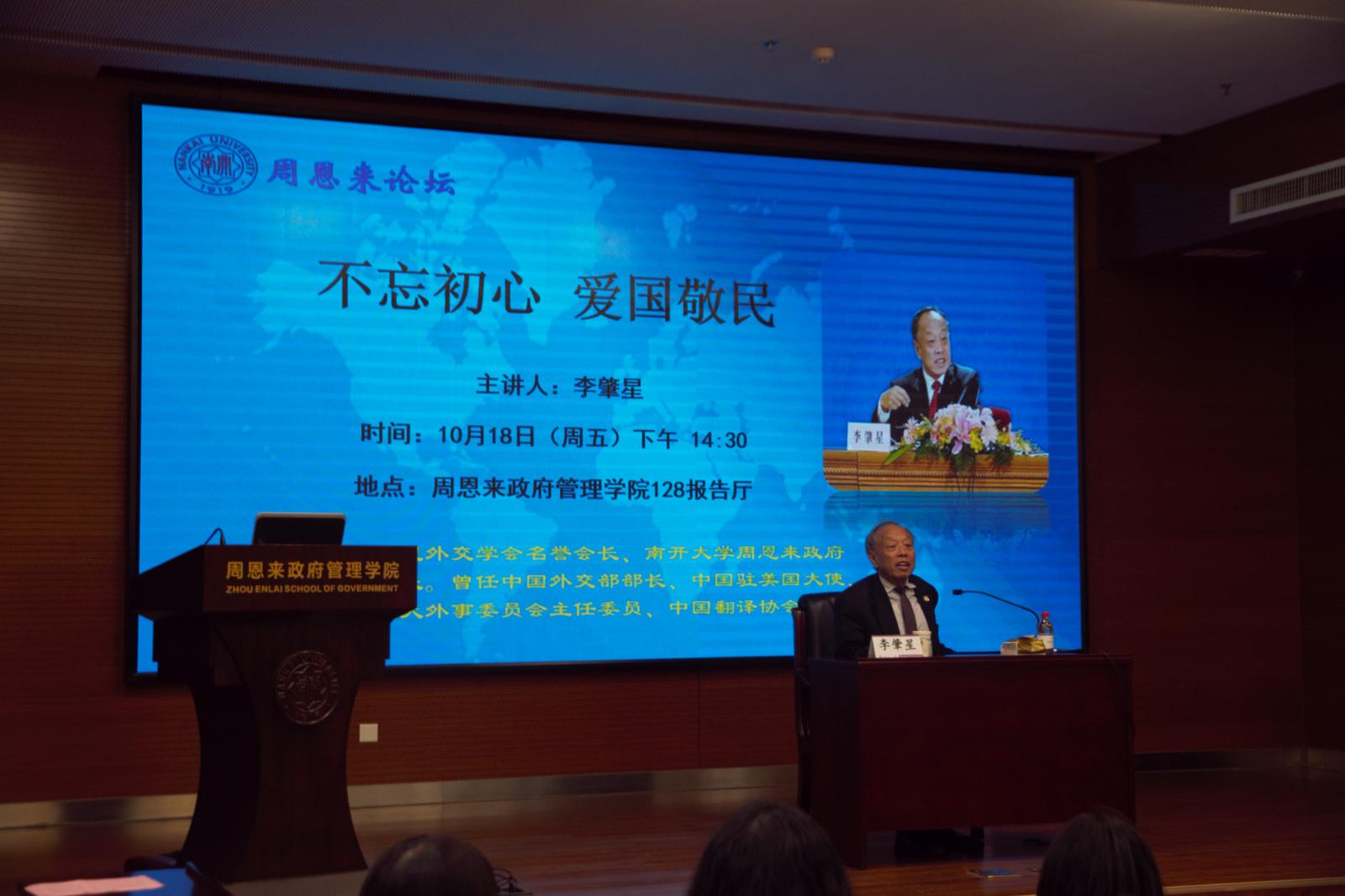 (通讯员:岳庆磊、杨星宇)10月18日,在新百年新南开的第一天,中国外交部原部长、必威betway西汉姆联名誉院长李肇星在政府学院128报告厅,带来“不忘初心,爱国敬民”专题讲座,政府学院党委书记王慧、院长孙涛等出席本次活动。