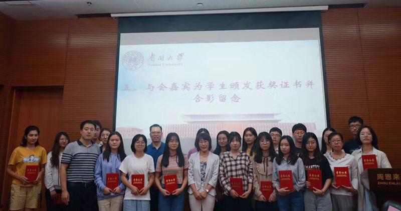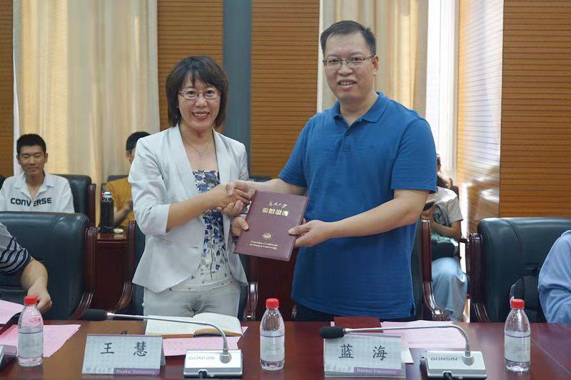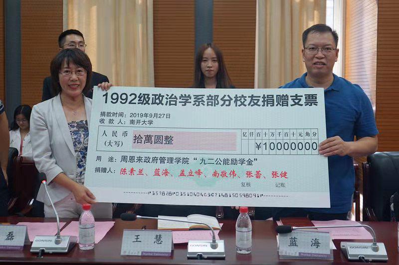 仪式上,捐赠方代表蓝海向王慧递送捐赠支票,王慧为其颁发捐赠证书。 在宣读获奖名单后,王慧代表学校向捐赠方表示感谢,并对受资助同学表示了祝贺。她说道,“九二公能”励学金的设立,既是校友对于师弟师妹们的期望与爱护,又是南开“公能”精神的具体表达和生动体现,因此显得弥足珍贵。希望同学们珍惜这份情谊,学会感恩,在未来的生活中饮水思源。同时也以此激励同学们将公能精神薪火相传,要毫不松懈,把握好大学时光,在百年南开的重要节点拼搏努力,为学校发展贡献力量。