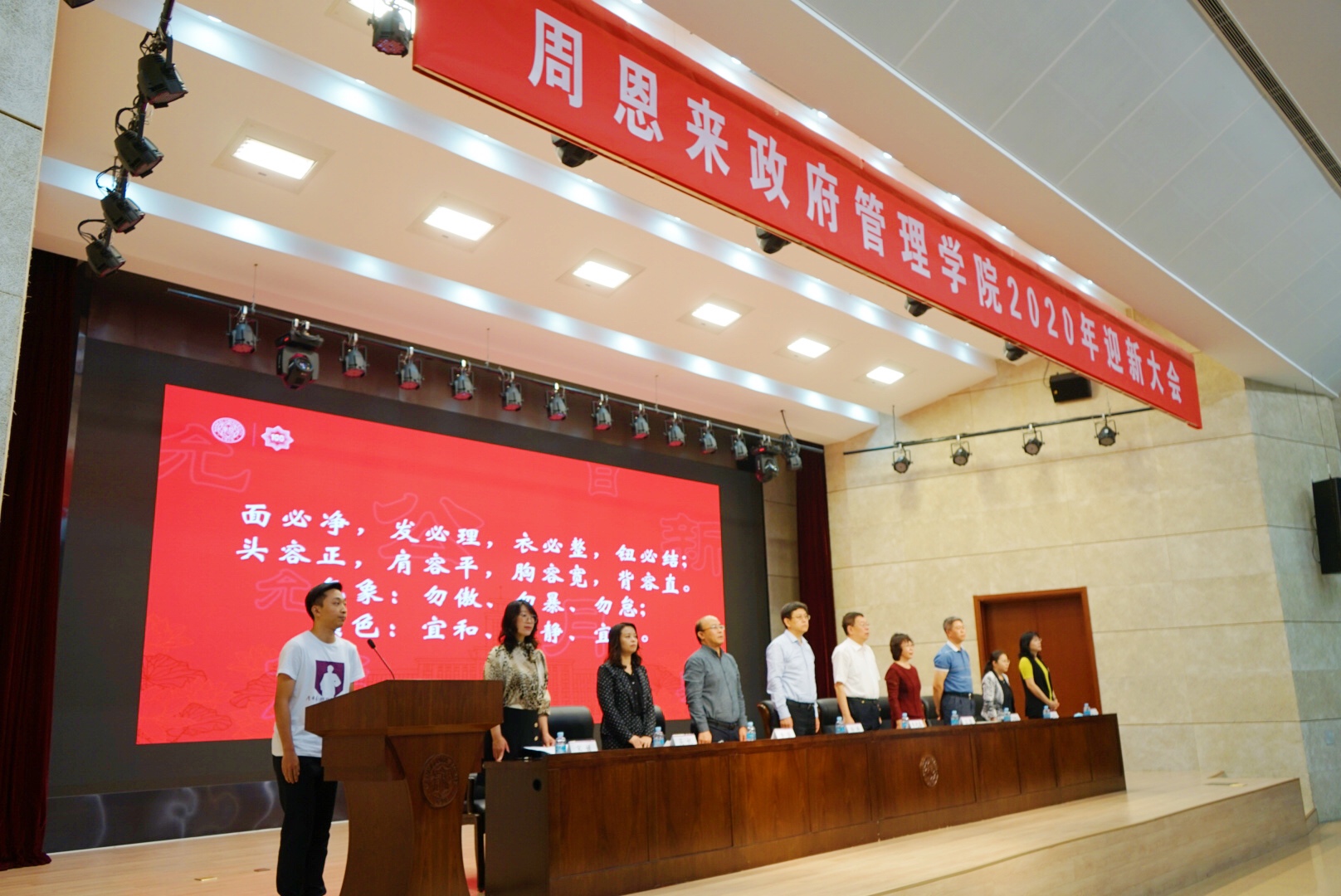 “面必净,发必理,衣必整,纽必结;头容正,肩容平,胸容宽,背容直。勿傲,勿暴,勿怠;宜和,宜静,宜庄。”在2020级硕士研究生薛博文的带领下,全体师生齐声诵读南开容止格言,正衣冠面容,立志做真正的南开人。